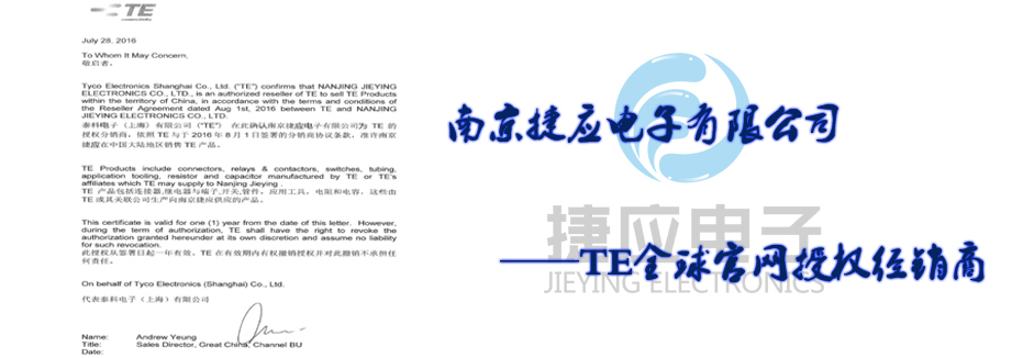 南京捷應電子有限公司是國際無源器件品牌美國泰科電子(TE)在中國華東地區的主要通路商,代理經銷旗下全系列產品包括TYCO(AMP)系列連接器、接插件、OEG、SCHRACK、P&B功率繼電器、美國RACHEM各類航空導線、熱縮套管、?s套、標識產品、電線電纜。